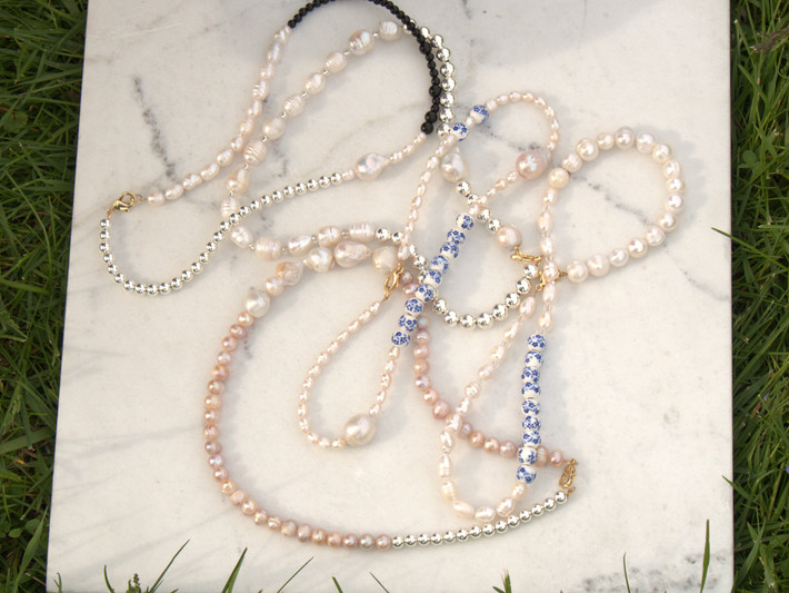 My grandma once worked in a jewelry shop in the small town of Wenatchee, Washington. When she passed away, her collection of jewelry was passed down to our family, myself included. I inherited a pearl necklace that would become a staple in my wardrobe. I wear this necklace almost every day, keeping my grandma close to my heart. Over time, I began to draw inspiration from my string of pearls, taking shape in the form of my designs. This collection is an extension of my fascination with pearls, which I want to make available to those around me.